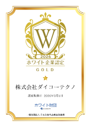 「ホワイト企業認定」とは、一般財団法人日本次世代企業普及機構(ホワイト財団)が“次世代に残すべき素晴らしい企業”を7つの指標から総合的に判断・評価し、認定を行うものです。ダイコーテクノは人材育成と働きがいを軸とした組織づくりを進めている点が評価されゴールドランクに認定されました。当社の取り組みの詳細は以下のページをご覧ください。